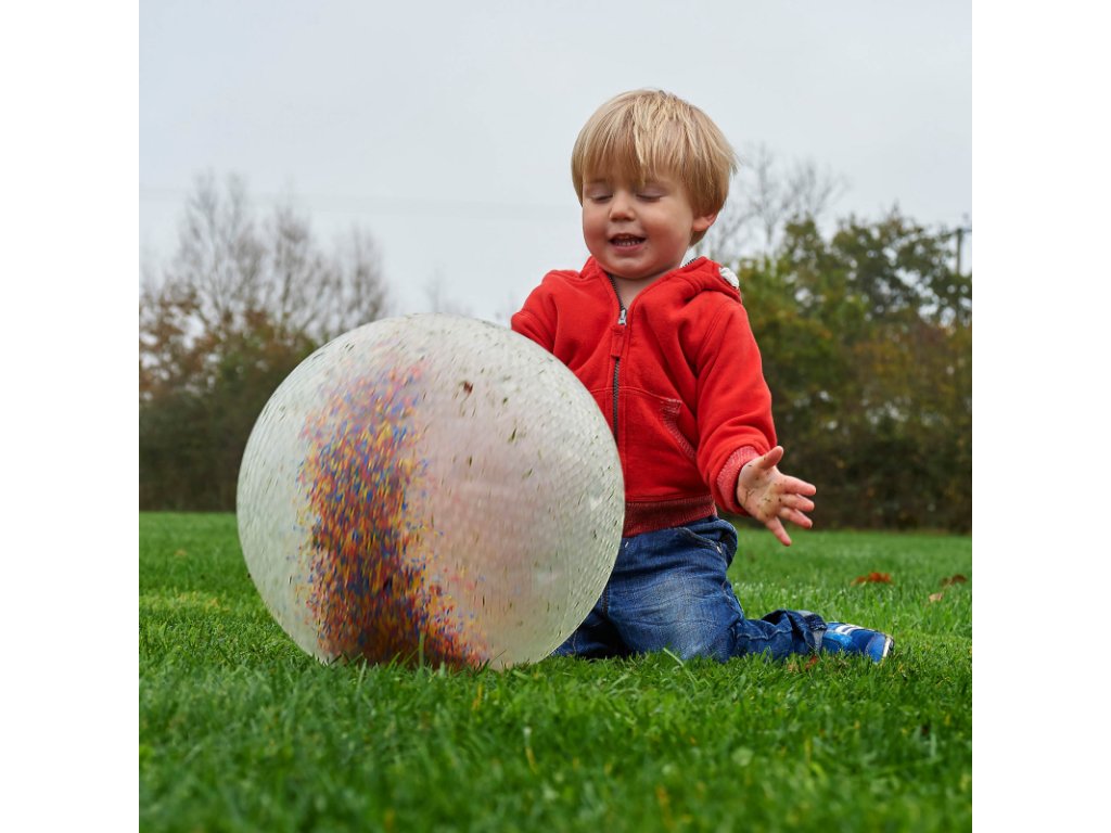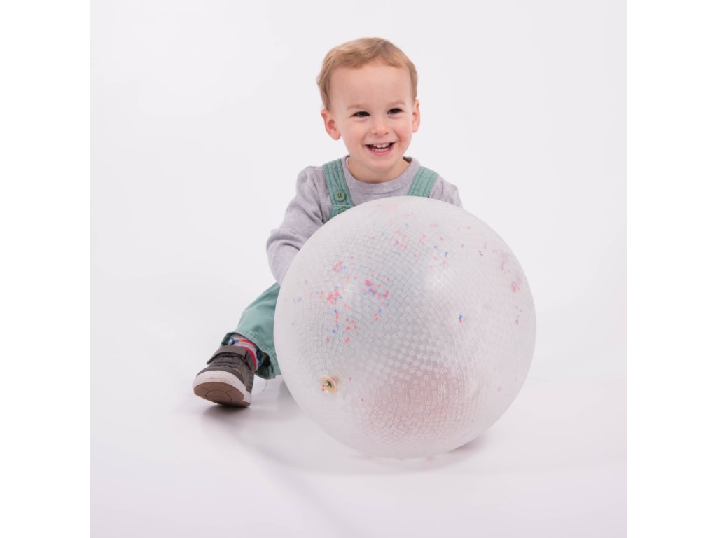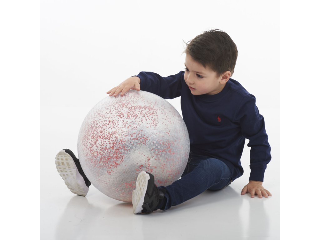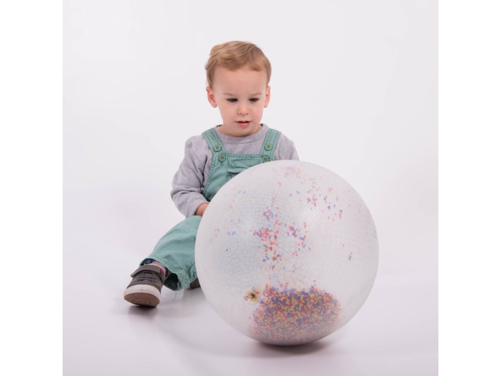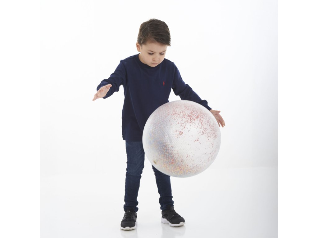 Velký průsvitný nafukovací míč s jemne strukturovaným povrchem obsahuje tisíce jemných plastových čáasticm, které chrastí a tancují, když balónem hází nebo kutálí. Díky obsahu částic uvnitř balónu je míč těžší než klasický nafukovací balón nebo malý gymnastický míč. Pomůcka je proto ideální pro jemnou a fyzicky kontrolovanou hru, přičemž se dětí můžou po něm válet nebo si míč jeden druhému přihrávat.