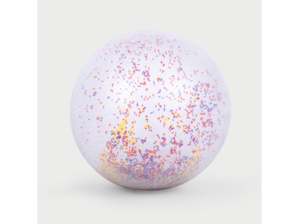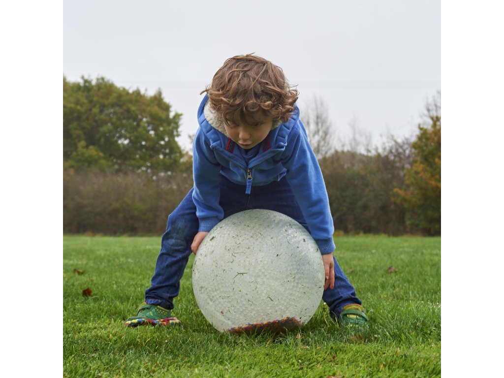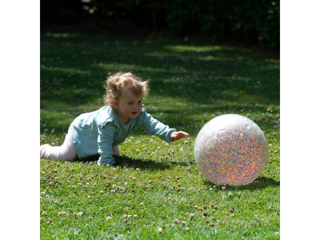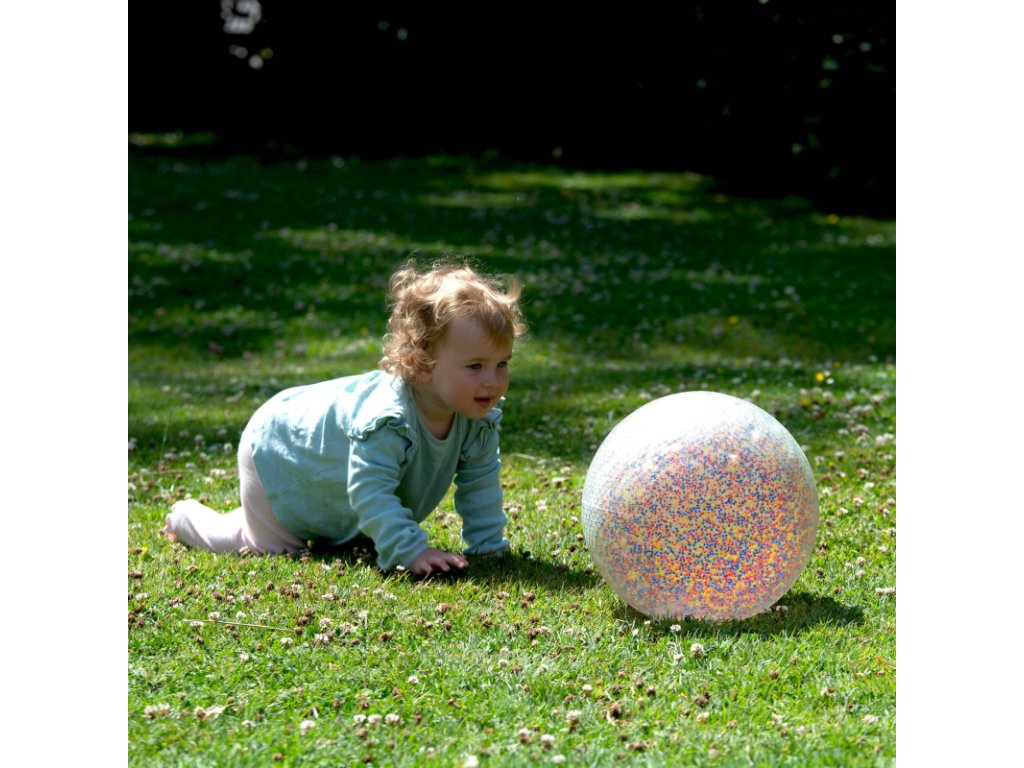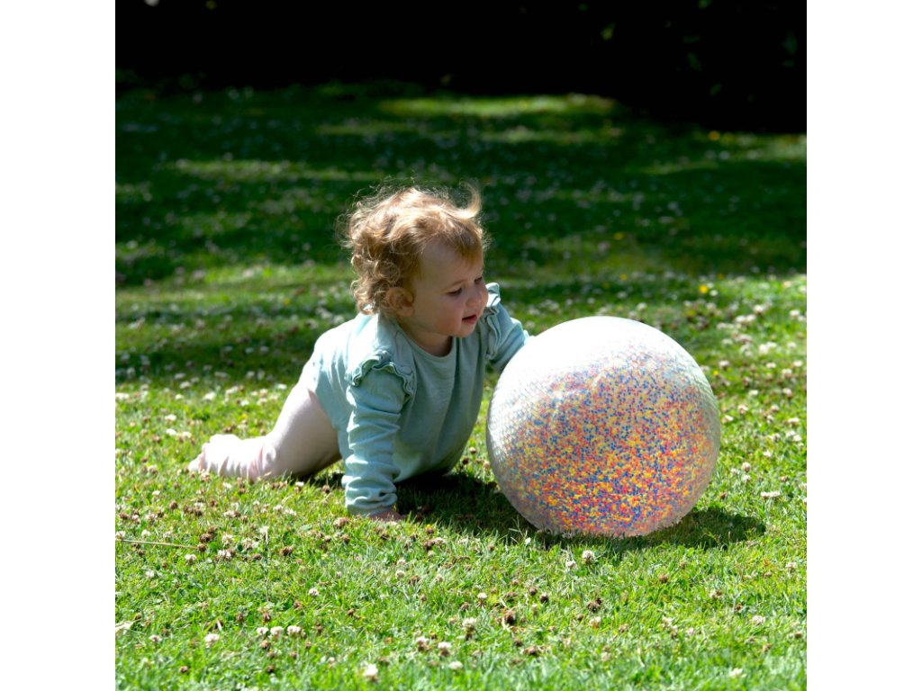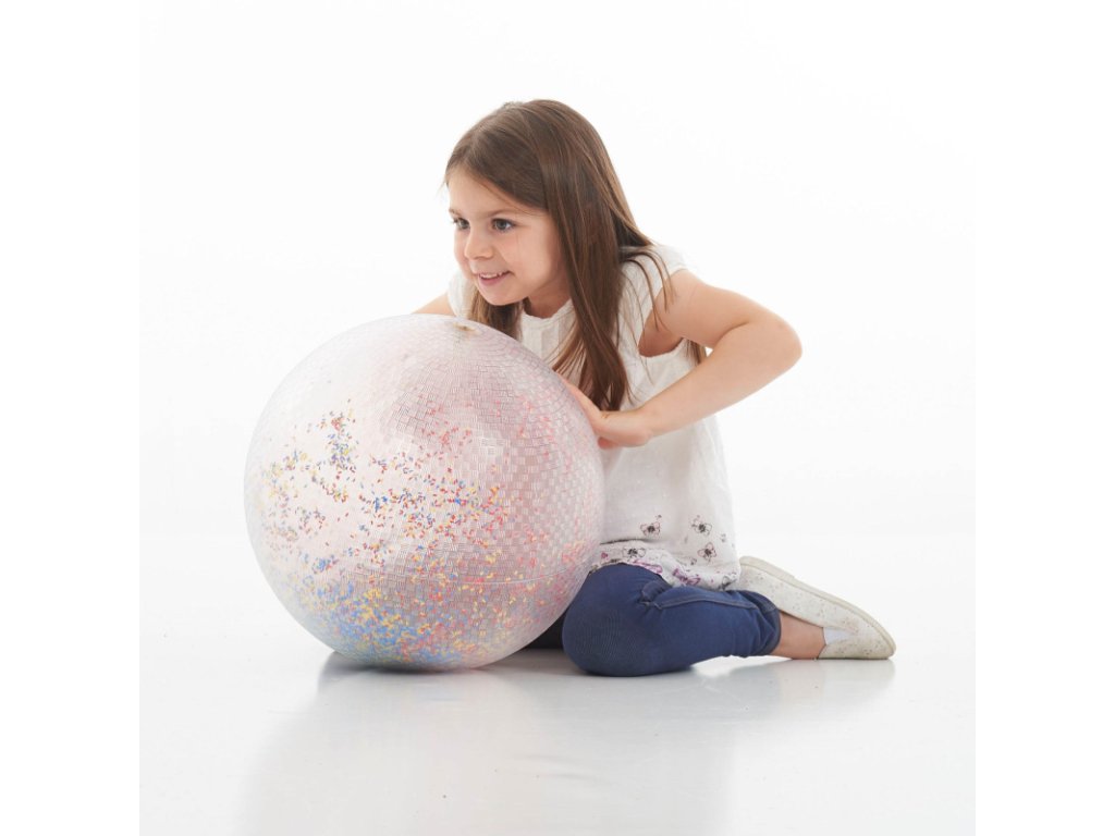 Velký průsvitný nafukovací míč s jemne strukturovaným povrchem obsahuje tisíce jemných plastových čáasticm, které chrastí a tancují, když balónem hází nebo kutálí. Díky obsahu částic uvnitř balónu je míč těžší než klasický nafukovací balón nebo malý gymnastický míč. Pomůcka je proto ideální pro jemnou a fyzicky kontrolovanou hru, přičemž se dětí můžou po něm válet nebo si míč jeden druhému přihrávat.